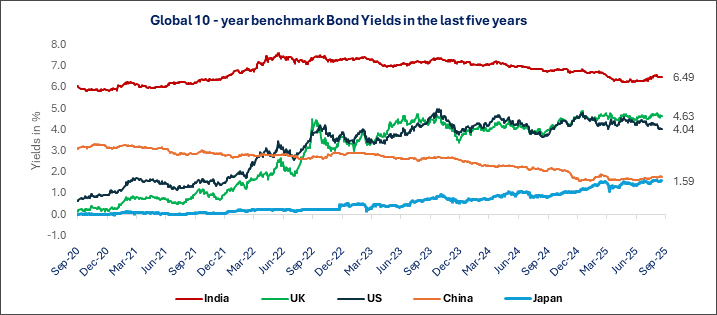 September was a pivotal month for fixed income markets, both globally and domestically. The U.S. Federal Reserve (Fed) delivered its first rate cut of 2025, trimming rates by 25 basis points, and signaling the possibility of two more cuts before the year ends, setting a clear tone for the global interest rate outlook. Back home, India received a confidence boost on the credit front, with Japan’s Rating and Investment Information Inc. (R&I) - upgrading India’s long-term sovereign rating from BBB to BBB+ the third positive rating action for FY26.