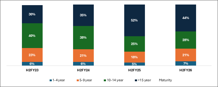 As anticipated, the government's borrowing plan for the second half of FY26 reaffirms both its fiscal deficit and borrowing targets. A key change in this plan is the reduction in the duration of bond issuances, which reflects a recognition of market demand limits. The yield curve had steepened significantly recently. The overall duration of new issuances has also increased from ~12 years in FY11 to ~21 years in FY25.