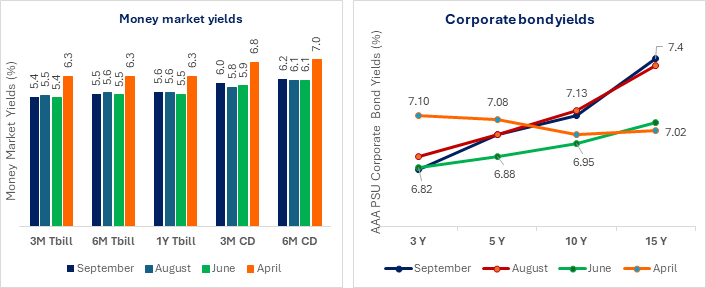 T-bill rates the remained more or less steady compared to August 2025. The 3-month AAA PSU CP/CD rates too remained steady in the 5.95%- 6.20% range on a closing basis.