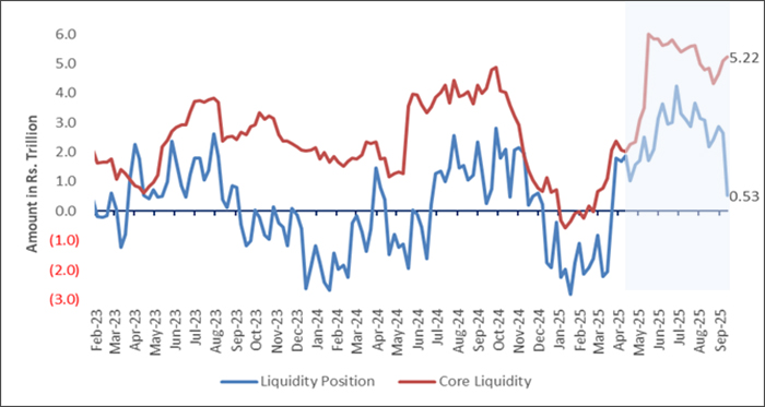 In September, India’s liquidity conditions shifted into a mild deficit during the month, primarily due to the combined effects of GST collections and stronger-than-expected advance tax payments.