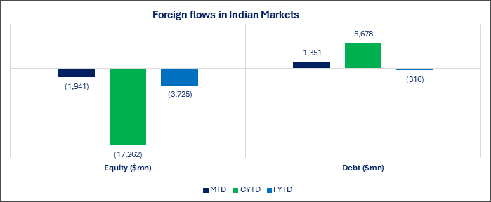 with the debt segment attracting $1,351 million during the month. However, this momentum could be challenged by escalating global trade tensions under the Trump administration. That said, India's three recent credit rating upgrades and affirmations are expected to boost investor confidence. Additionally, India's inclusion in the Bloomberg Emerging Market Index starting January 2026 could attract around $5 billion in inflows, driven by both passive and active investors.