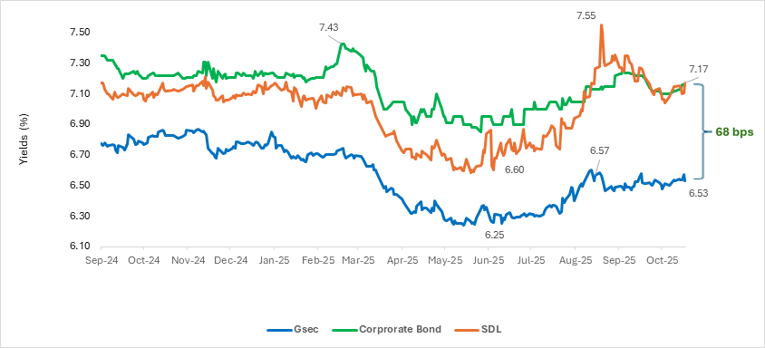 Source: Bloomberg. Above data is for the yields on the 10- year maturity of respective bond for the last twelve months - September 2024 to October 2025. Data on corporate bond yields is for AAA PSU corporate bonds.
