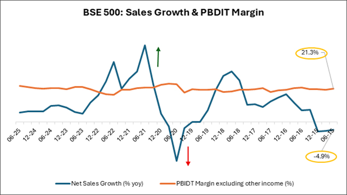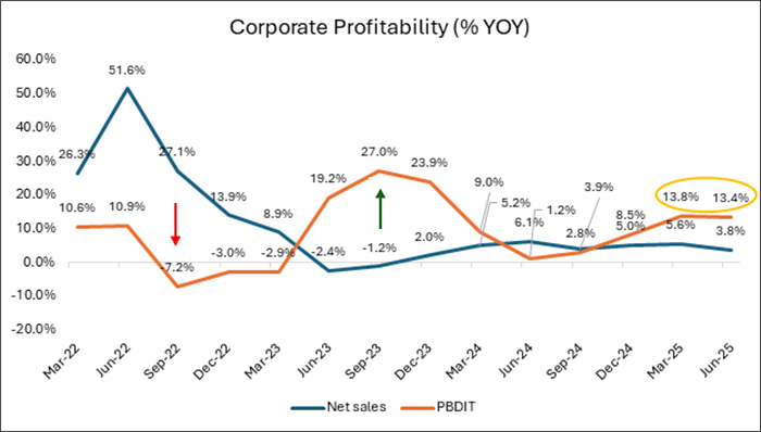 Source: CMIE; Quarterly Data as of 30 June 2025; Net Sales and PBIDT (Profit Before Interest, Depreciation and Taxes) growth is considered.
