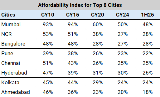 Source: Knight Frank. Affordability Index indicates the proportion of income that a household requires, to fund the monthly instalment (EMI) of a housing. Data as of 30 June 2025.