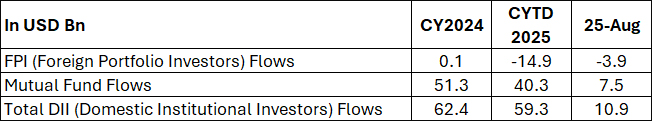The flows into equities remained resilient with strong DII (Domestic Institutional Investors) participation. FPI flows continued to be negative driven by valuation constraints in India and tariff uncertainty.