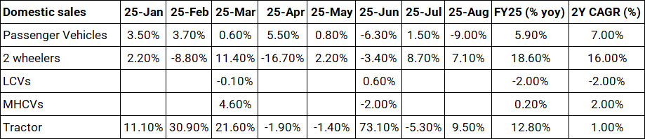Source: Society of Indian Automobile Manufacturers, Tractor and Mechanization Association; Data as of August 2025; Quarterly data is considered for LCVs (Light Commercial Vehicle) and MHCVs (Medium & Heavy Commercial Vehicles).