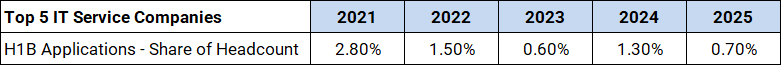 • Over the past several years, Indian IT Services have reduced the dependence on H1B (Refer Table 6). H1B share of total headcount currently is 0.7% in FY25. In our view; these changes are manageable and eventually there can be higher offshoring and nearshoring (geographies with similar time-zone and proximity to US).
