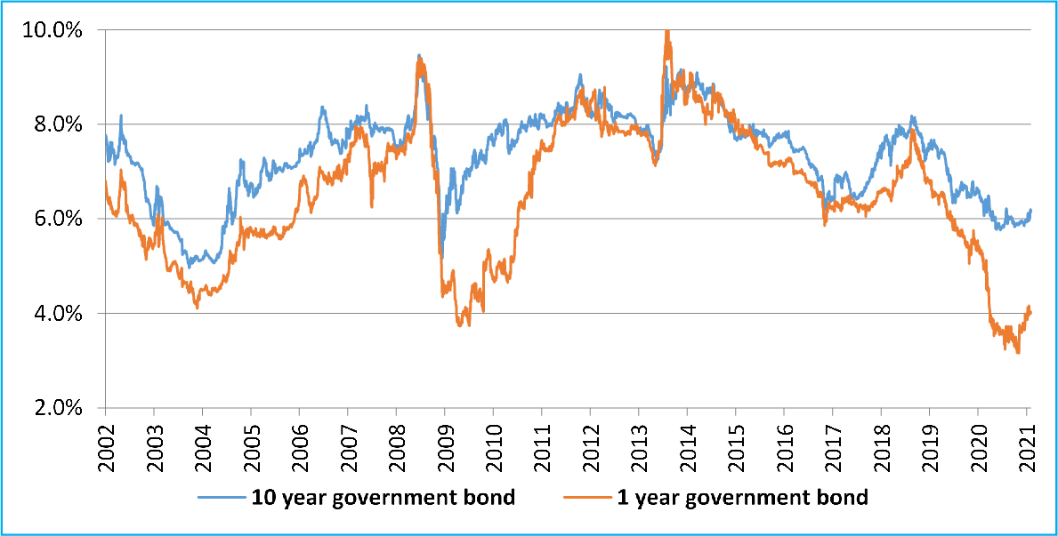 Indian bond markets mirrored the move in the US treasury. Since the start of new calendar, Indian bond yields have moved up by 30-80 basis points across the maturity curve. The 10 year Indian government bond yield rose by about 35 basis points from 5.87% on 31st Dec 2020 to around 6.22% now. In the same period the 5 year government bond yield moved up by 76 basis points from 5.09% to 5.85%.