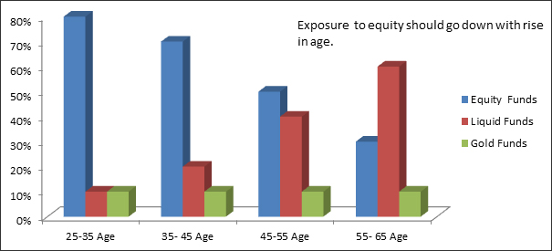 2. Invest in all 3 types of mutual funds, equity, gold and debt